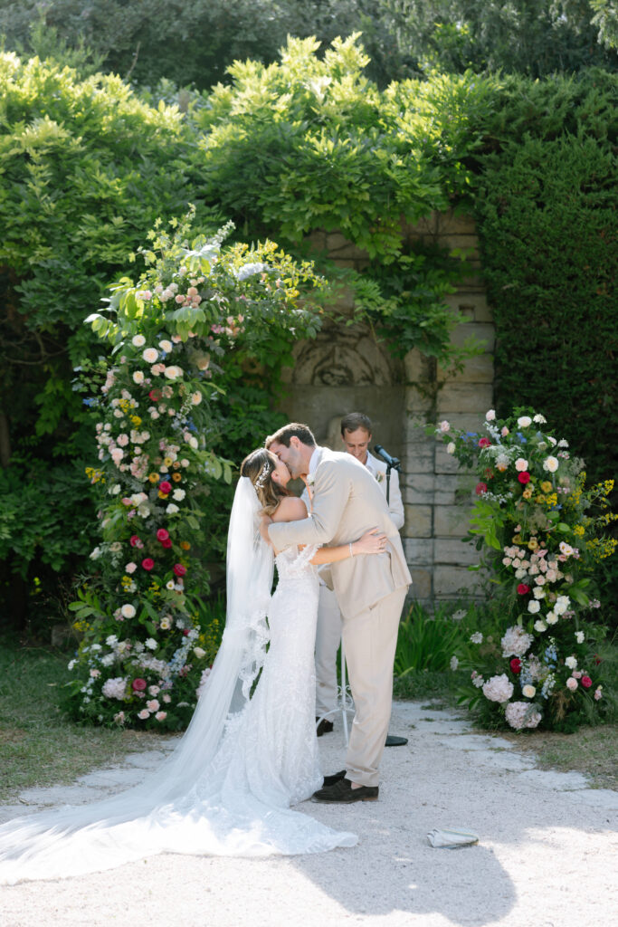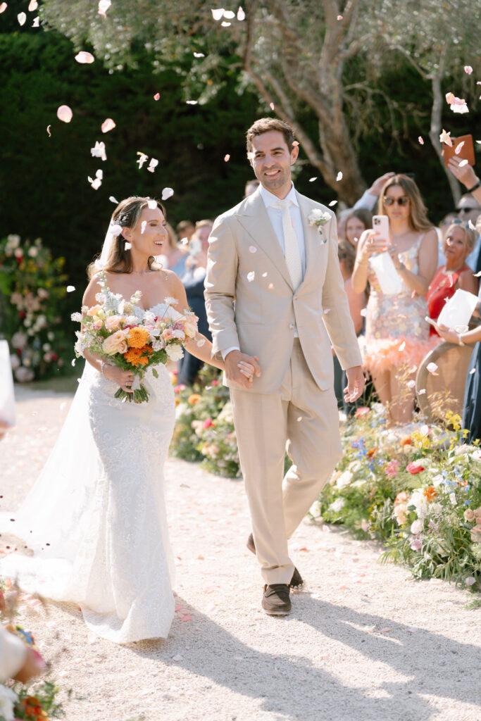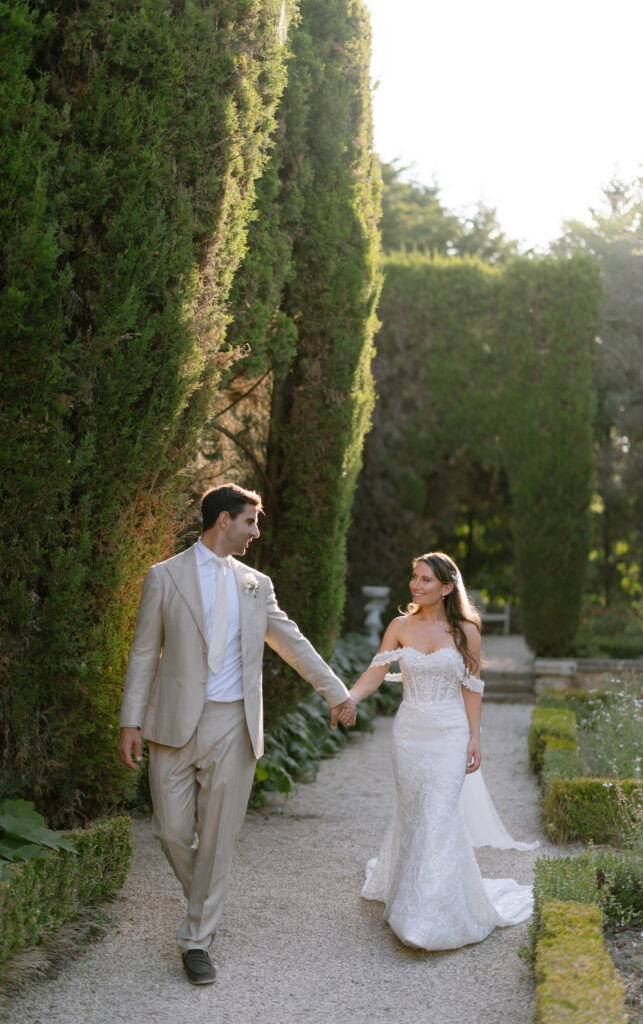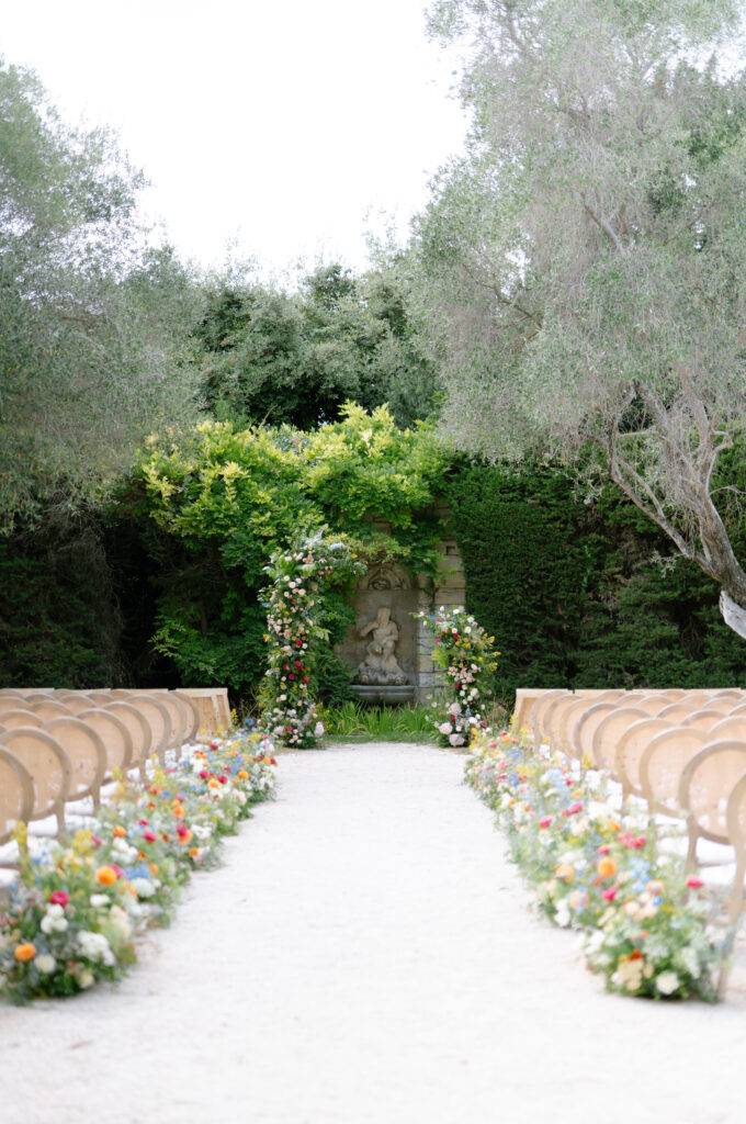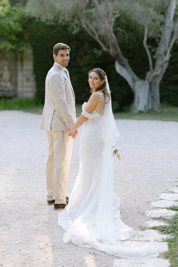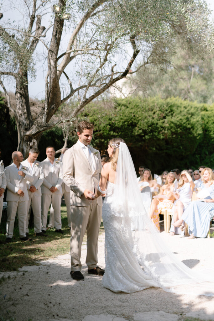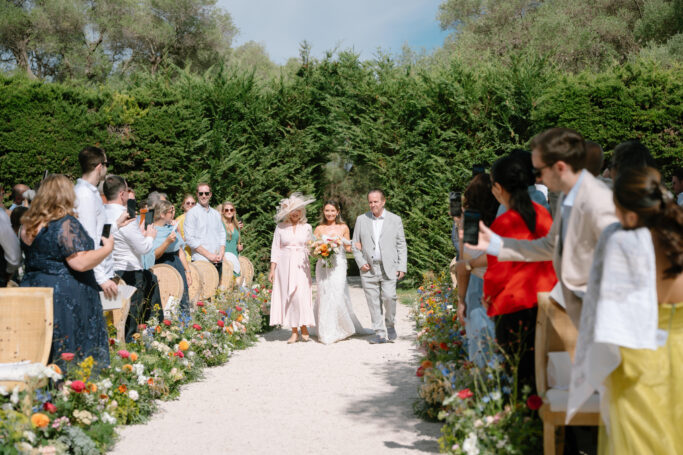 Shiri and Dylan exchanged vows in the gardens, surrounded by olive trees and soft summer light. The ceremony aisle was lined with abundant florals by Sisters and B Floral Design, creating a romantic pathway that felt organic and beautifully in tune with the Provençal surroundings.