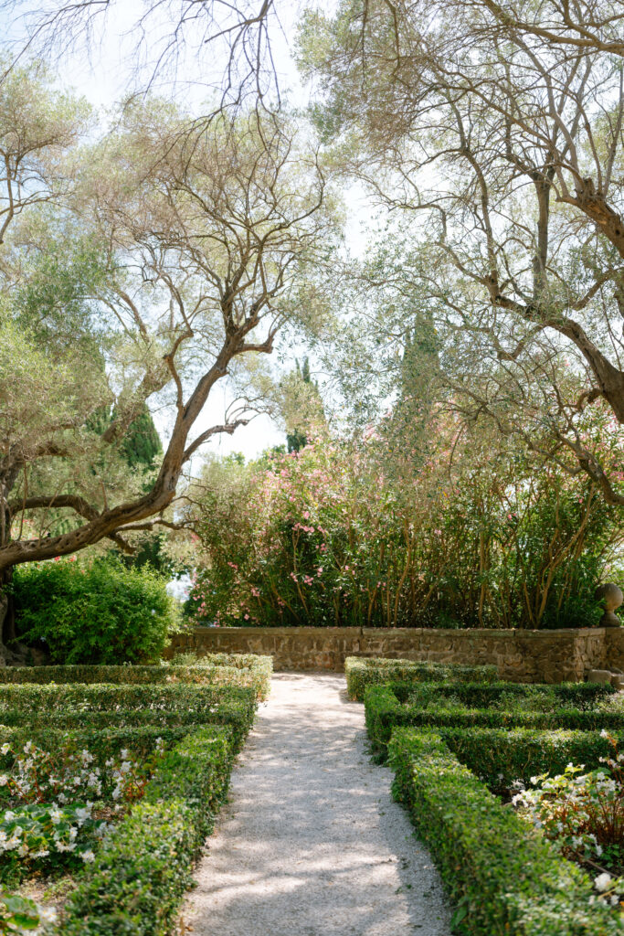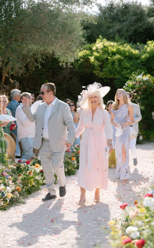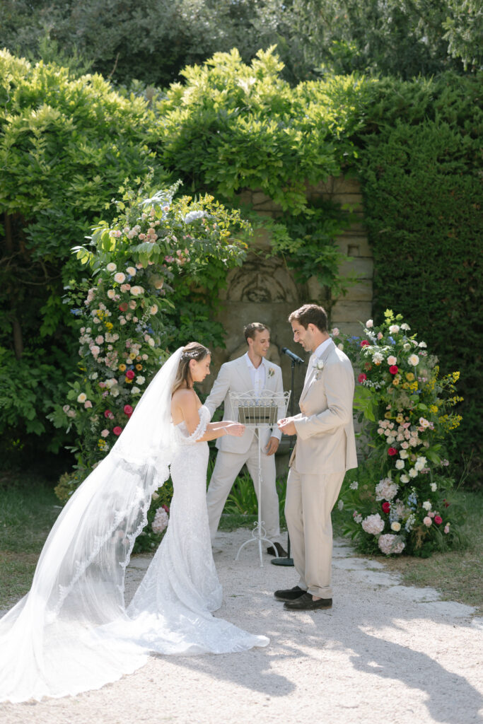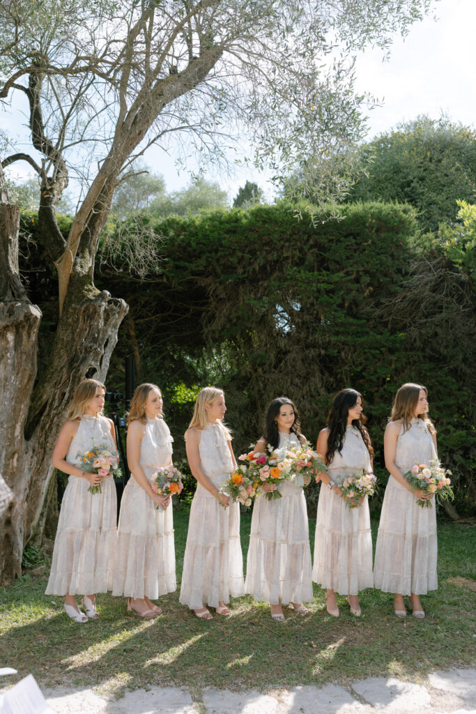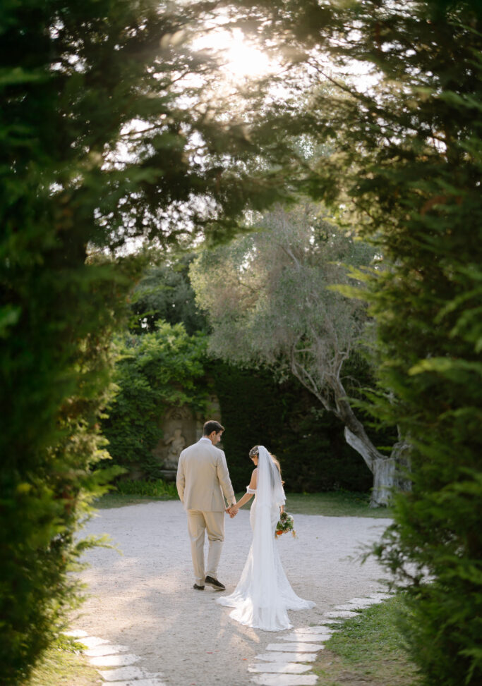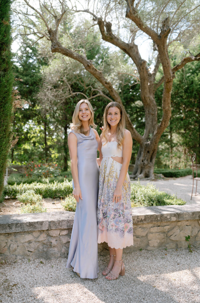 Shiri and Dylan exchanged vows in the gardens, surrounded by olive trees and soft summer light. The ceremony aisle was lined with abundant florals by Sisters and B Floral Design, creating a romantic pathway that felt organic and beautifully in tune with the Provençal surroundings.