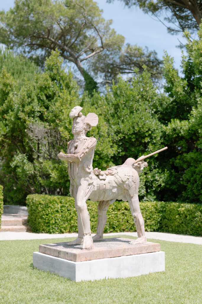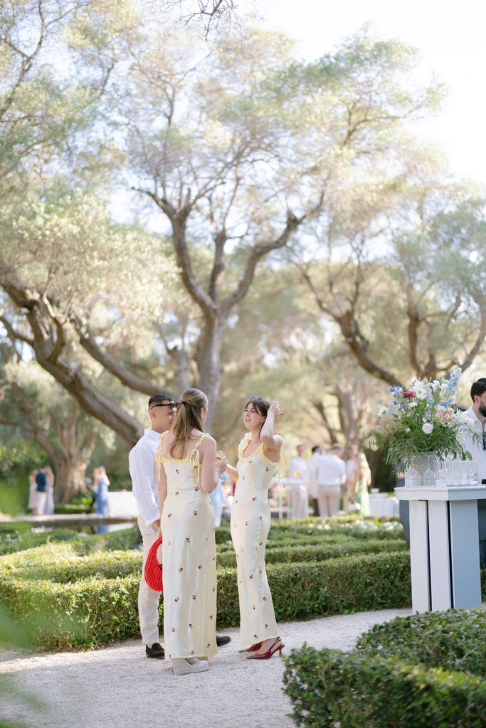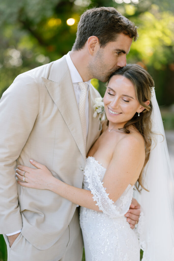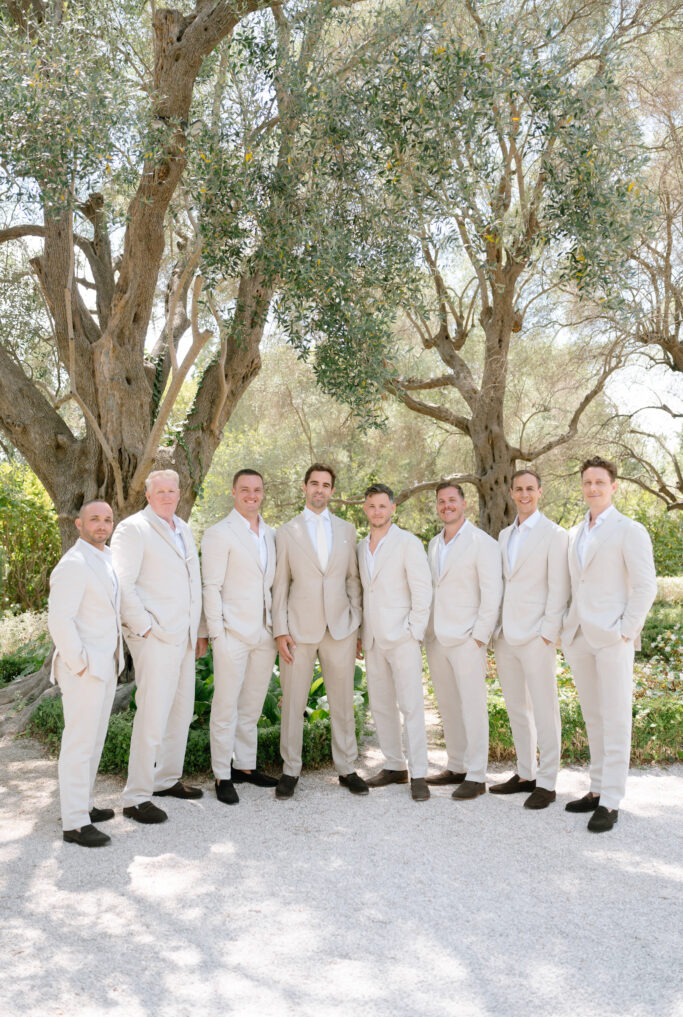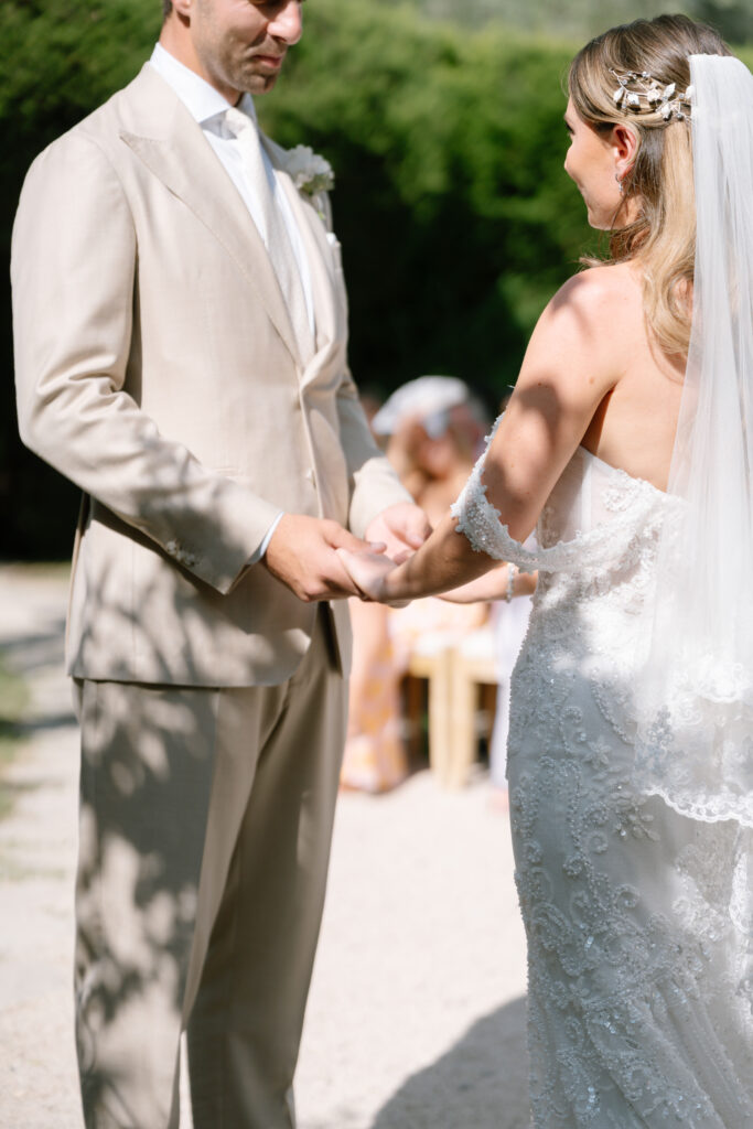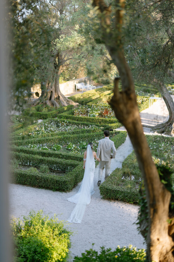 Shiri and Dylan exchanged vows in the gardens, surrounded by olive trees and soft summer light. The ceremony aisle was lined with abundant florals by Sisters and B Floral Design, creating a romantic pathway that felt organic and beautifully in tune with the Provençal surroundings.