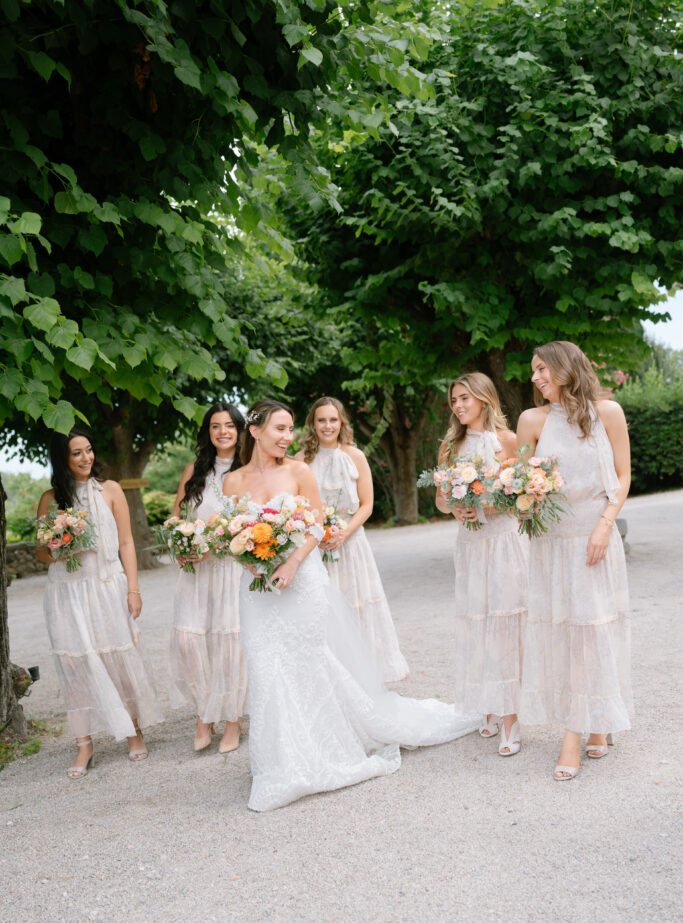 Following the ceremony, we captured relaxed bridal party portraits as Shiri walked through the tree lined paths with her bridesmaids. Dressed in soft flowing gowns and carrying textured bouquets, these moments felt effortless, joyful, and completely unforced.