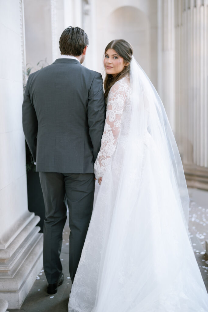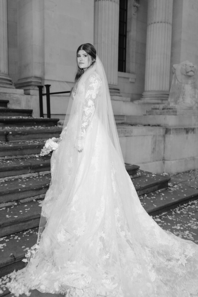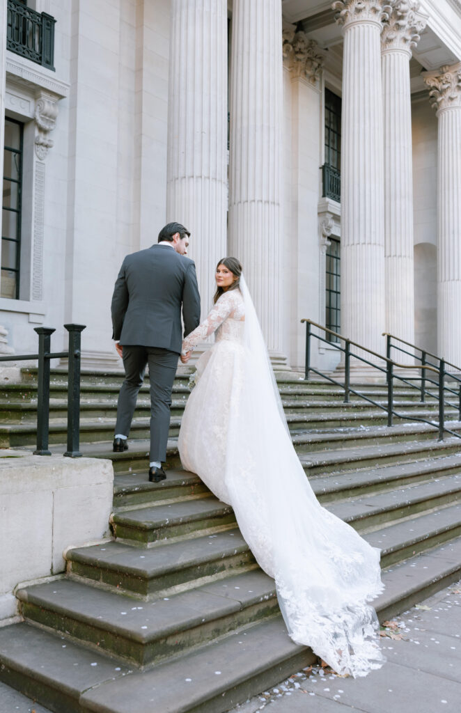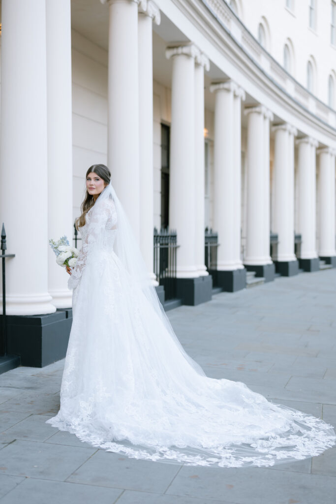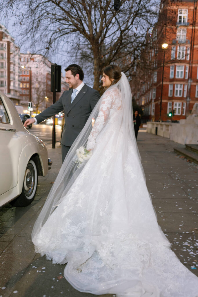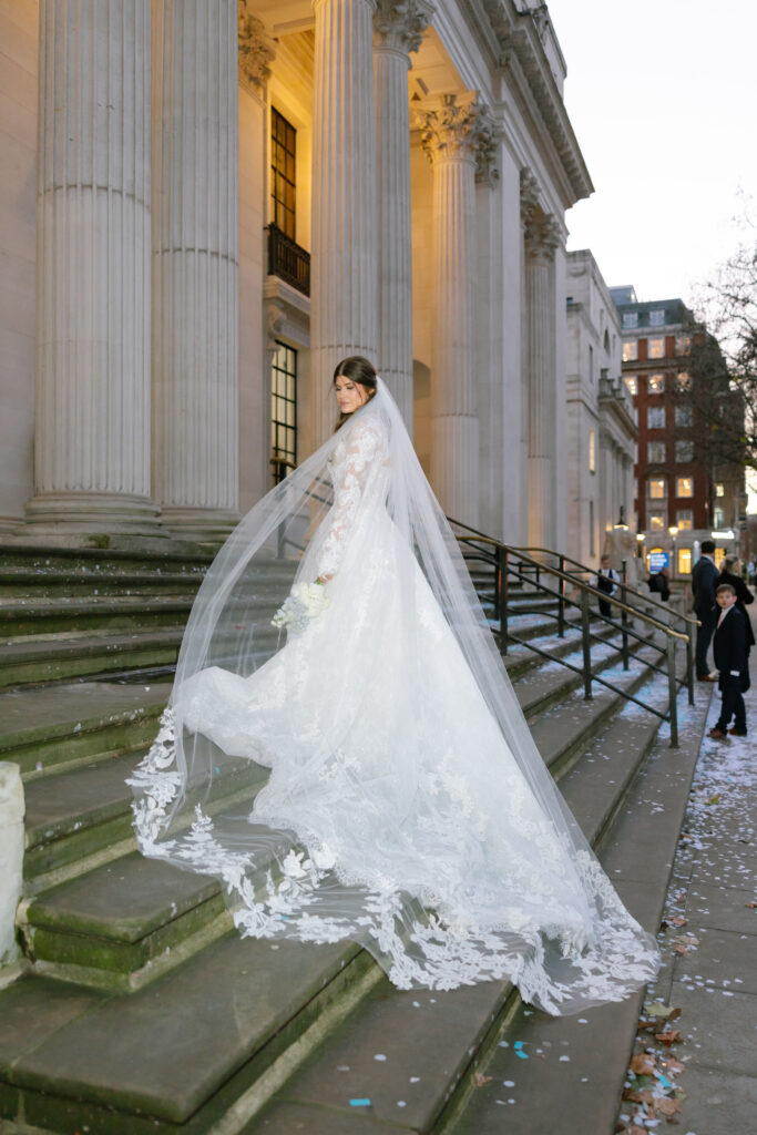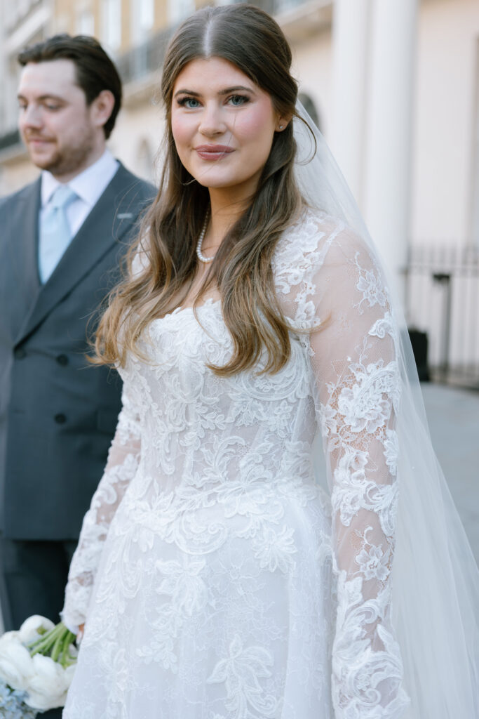 Alina wore a stunning lace wedding dress from Surrey Brides, with long sleeves and intricate detailing that felt perfect for a winter Old Marylebone Town Hall wedding. Every detail was thoughtful, refined, and effortlessly elegant.