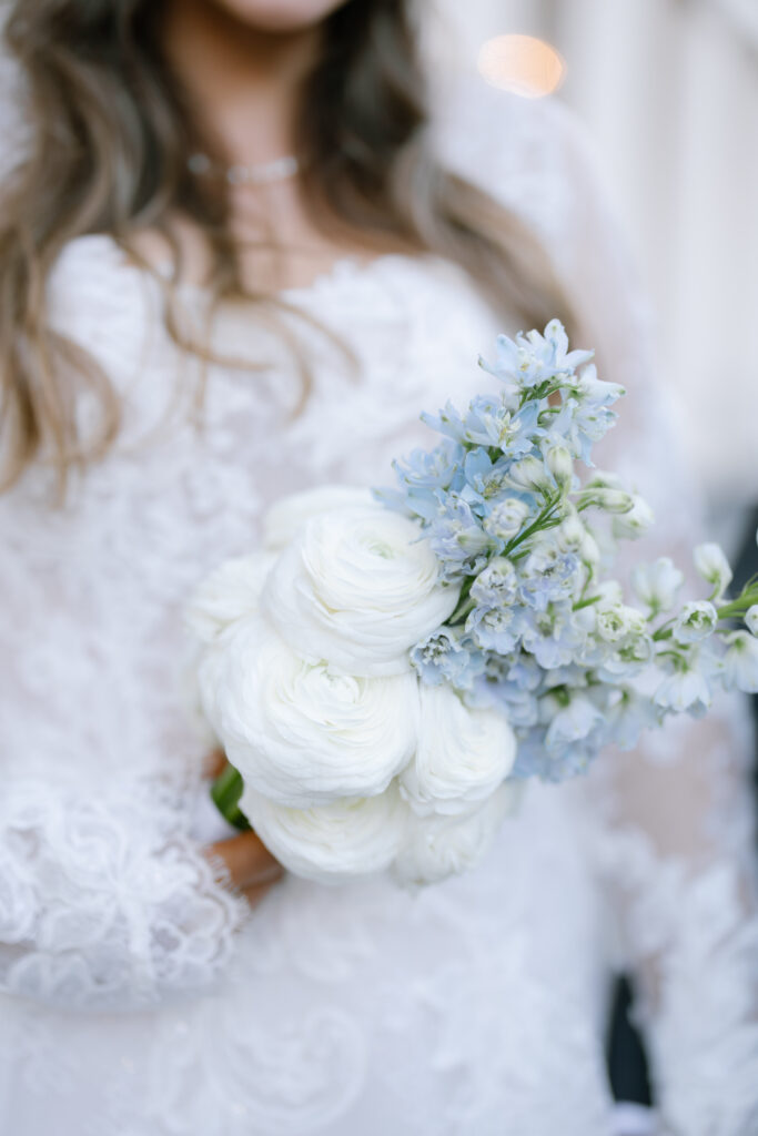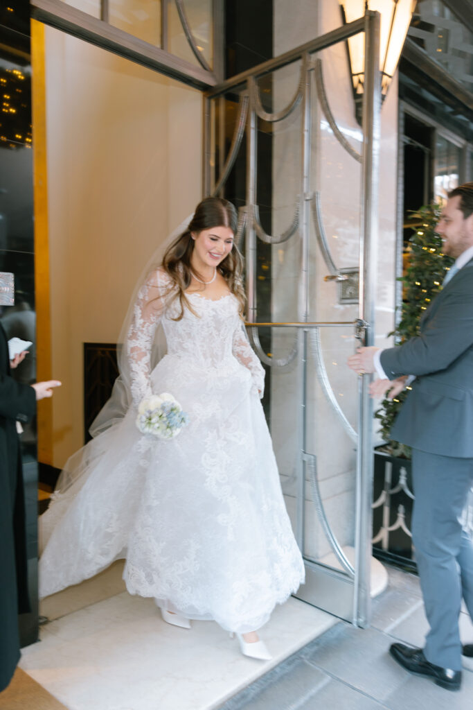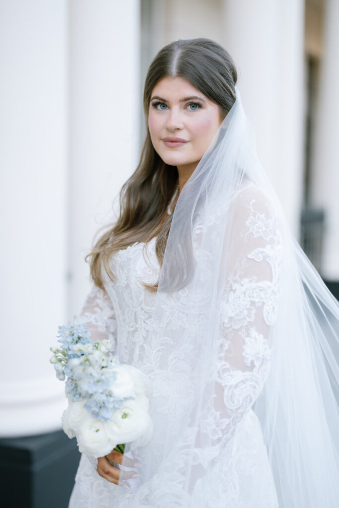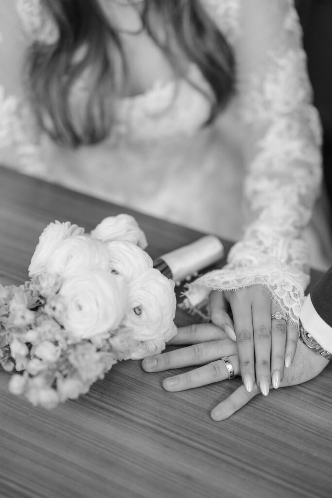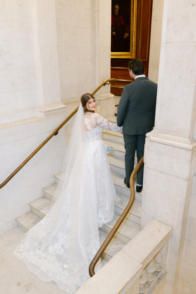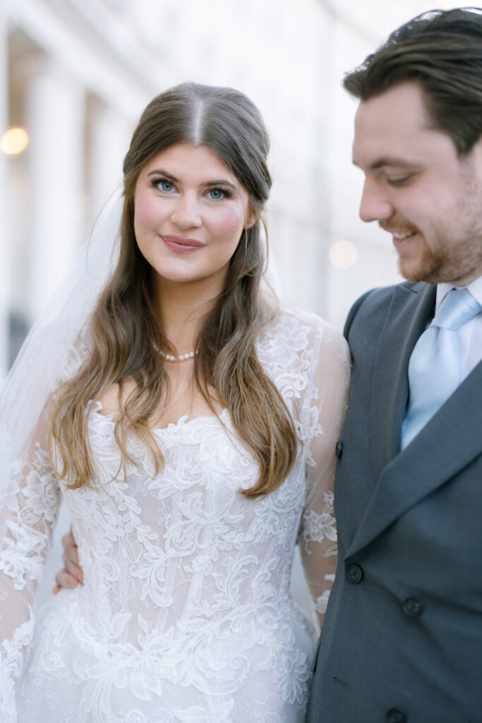 Alina wore a stunning lace wedding dress from Surrey Brides, with long sleeves and intricate detailing that felt perfect for a winter Old Marylebone Town Hall wedding. Every detail was thoughtful, refined, and effortlessly elegant.