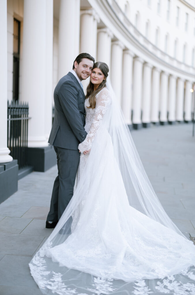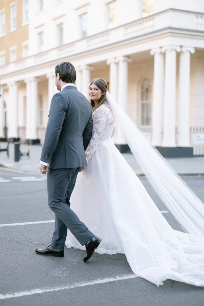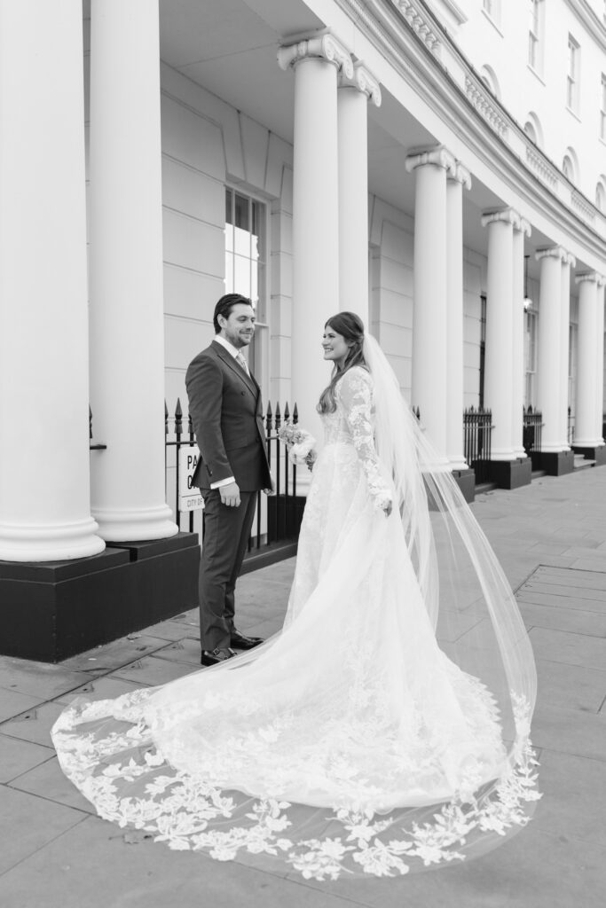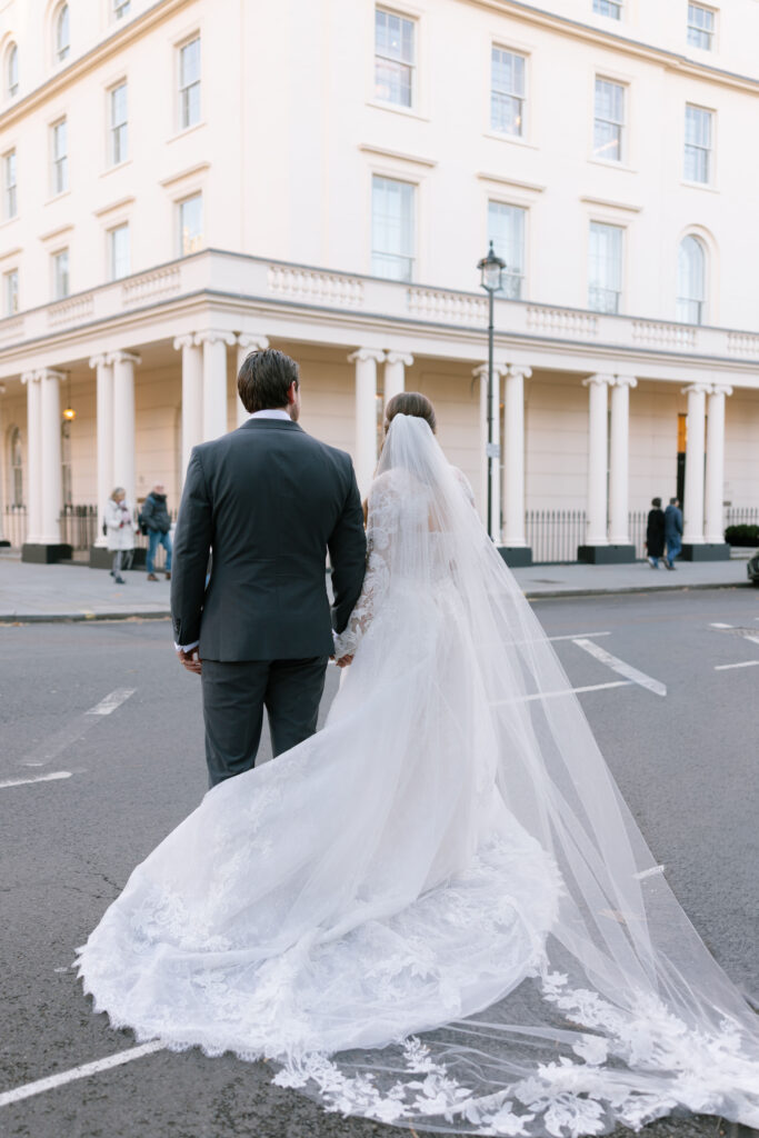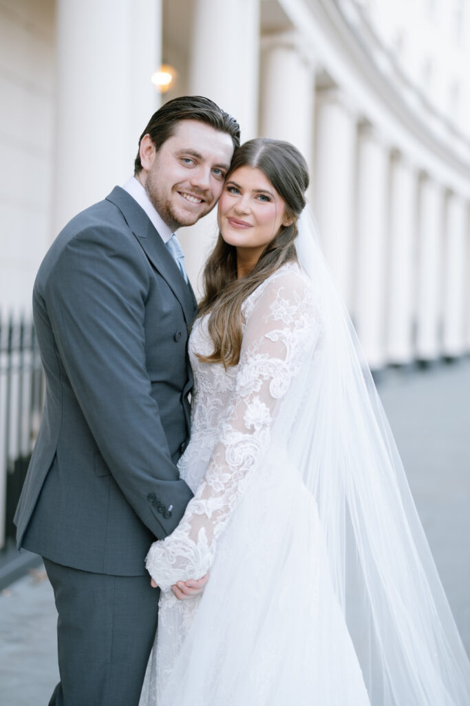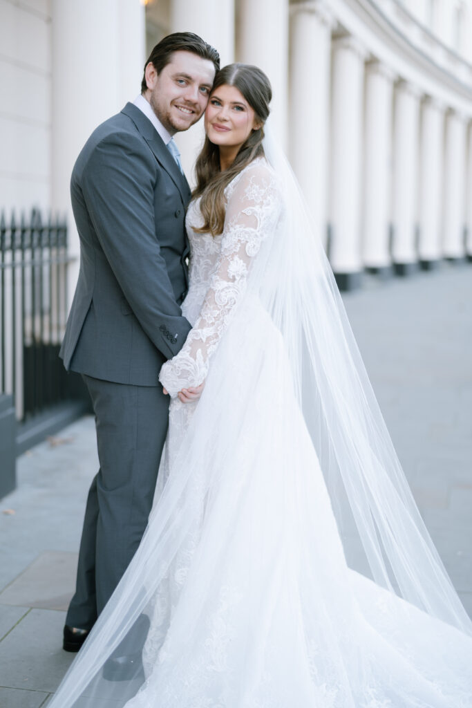 After the ceremony, we captured relaxed couple portraits around Marylebone. Winter weddings here have a unique charm, soft light, quieter streets, and elegant architecture at every turn. Alina and Shea were completely at ease together, making the portraits feel natural, romantic, and true to them.