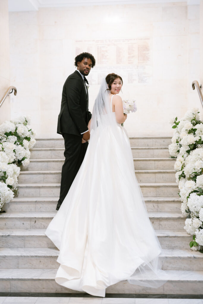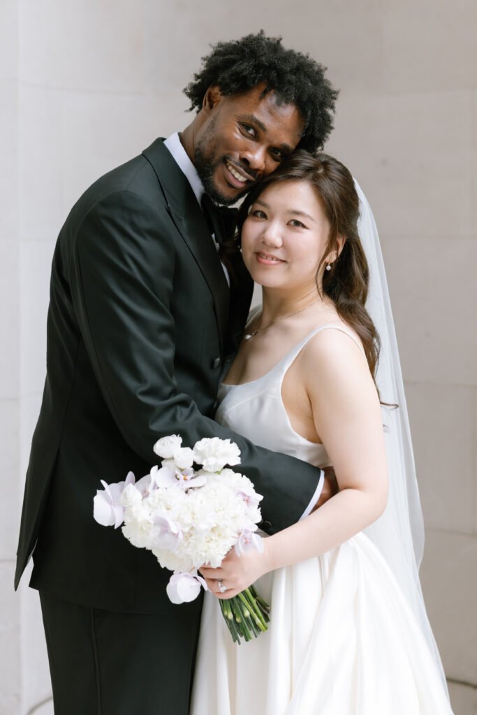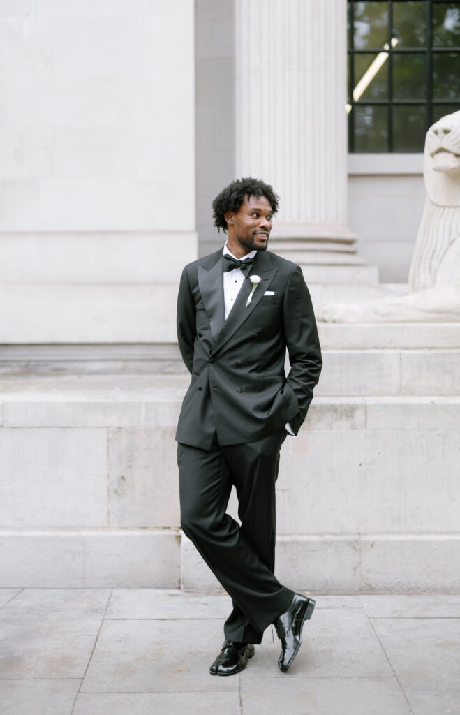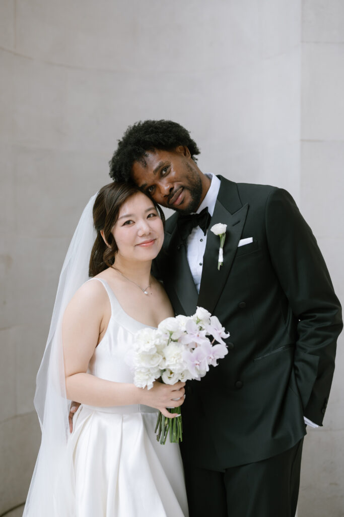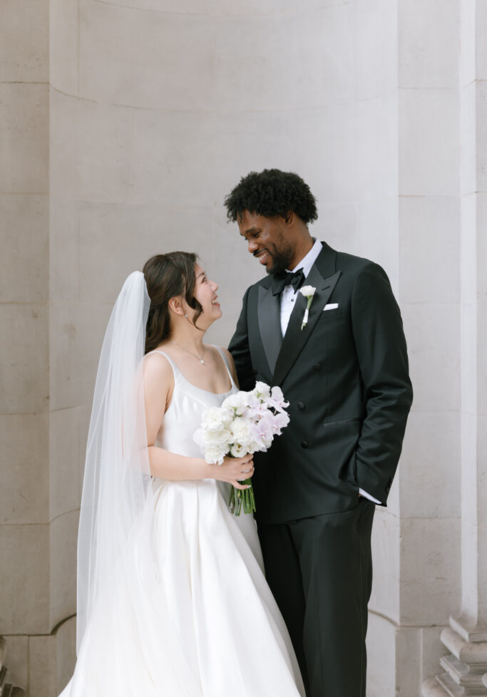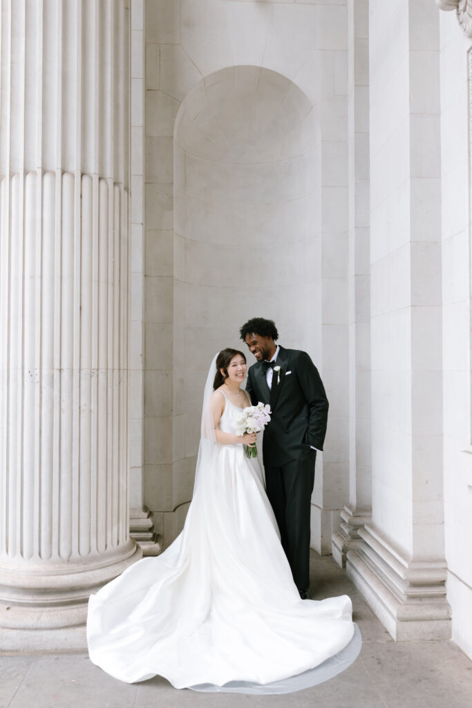 After the ceremony, we stepped outside to capture portraits around Old Marylebone Town Hall. The iconic columns, sweeping steps, and clean stone backdrop create endless opportunities for elegant and romantic wedding photography.