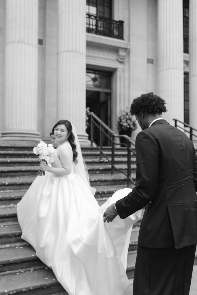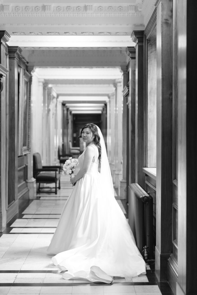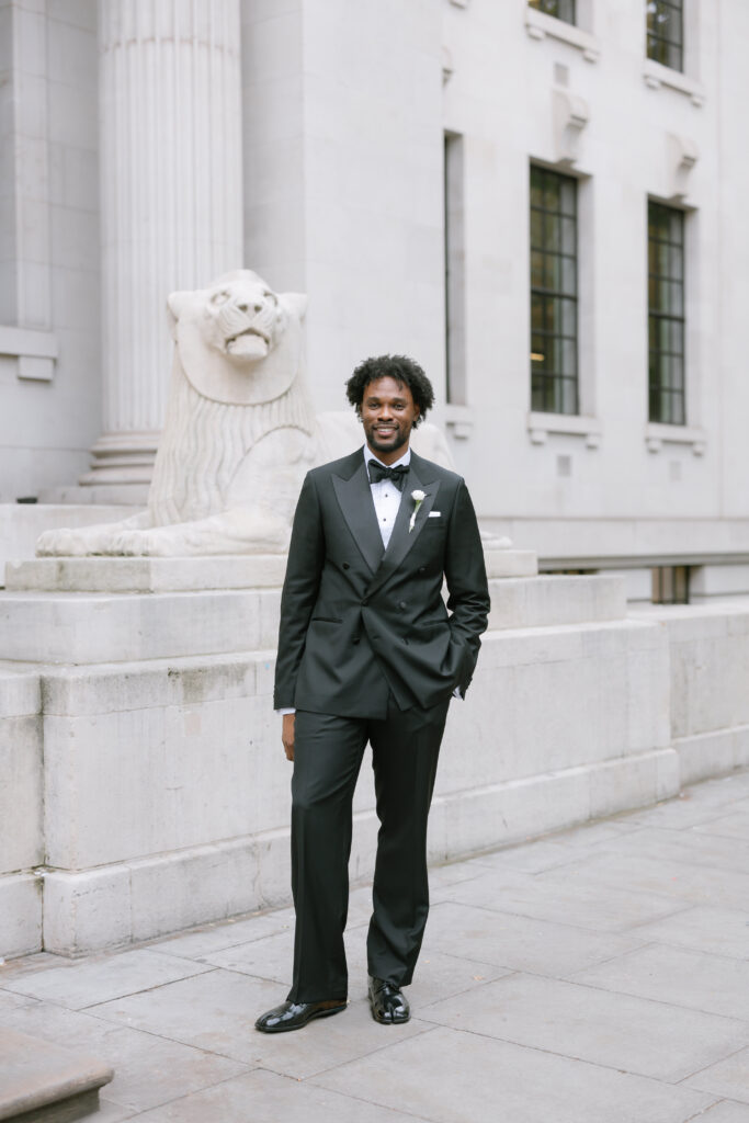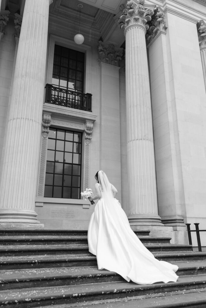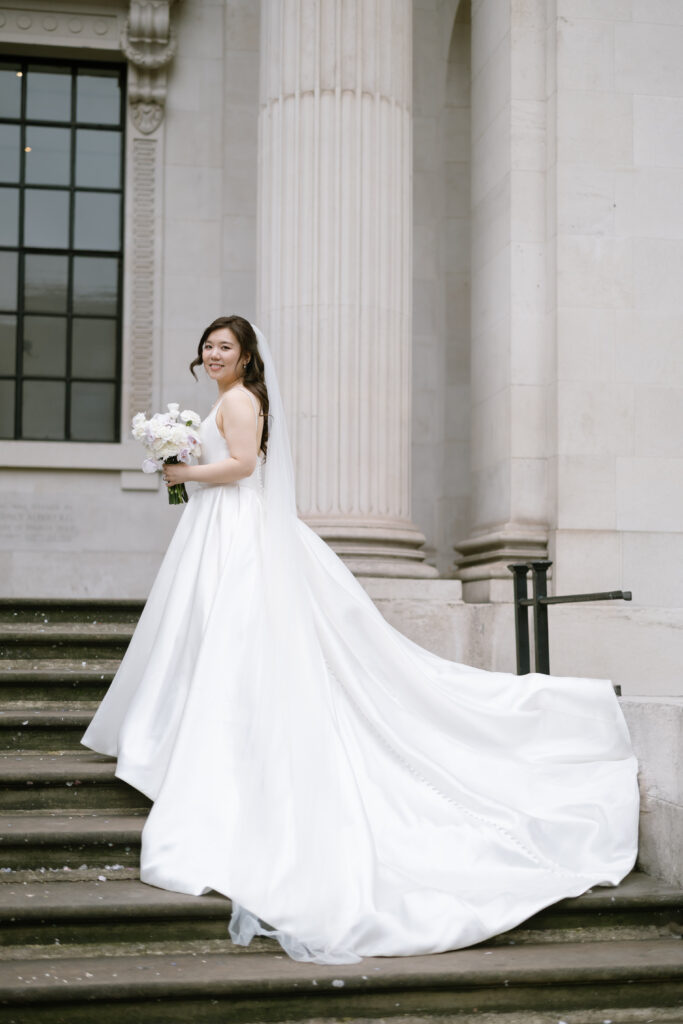 Haley wore the most elegant gown by Avenue 22 Bridal, a beautifully structured dress that moved effortlessly and photographed like a dream against the grand architecture of the town hall. Her look was timeless and refined, perfectly complementing the classic London surroundings.